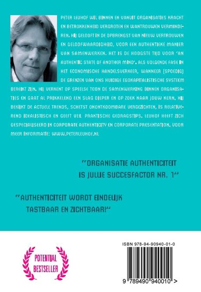 Leer en studeer over de kracht van authenticiteit. Voor iedere werknemer, voor leidinggevenden en voor hun organisaties. Authenticiteit is de nieuwe onderscheidende verkoop- en acceptatiefactor. Nep, standaard en me-too zijn over. Stake holders zoeken betekenis en zingeving (eerst het 'waarom', 'wie' en het 'hoe', pas daarna het 'wat'). De auteur deelt zijn visie en verkent op speelse toon de samenwerking binnen organisaties. Hij vermijdt oppervlakkigheid en gaat al prikkelend een slag dieper en op zoek naar zijn eigen en jouw kernwaarden. Hij bekijkt trends, schetst onontkoombare vergezichten, is relativerend idealistisch en geeft veel praktische gedragstips. Hij schrijft in een geheel eigen spreekstijl en gebruikt ter afwisseling verdiepende quotes (in een actuele 2e editie).