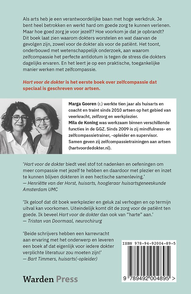 'Hart voor de dokter' is het eerste boek over zelfcompassie dat speciaal is geschreven voor artsen. Marga Gooren en Mila de Koning leggen op een praktische, heldere en toegankelijke manier uit hoe je kunt werken met zelfcompassie. Zelfcompassie leert je milder voor jezelf te zijn. Beter om te gaan met moeilijke emoties en lastige relaties. Stil te staan bij je eigen behoeftes en grenzen aan te geven. Zodat je met meer plezier en voldoening kunt werken en leven!