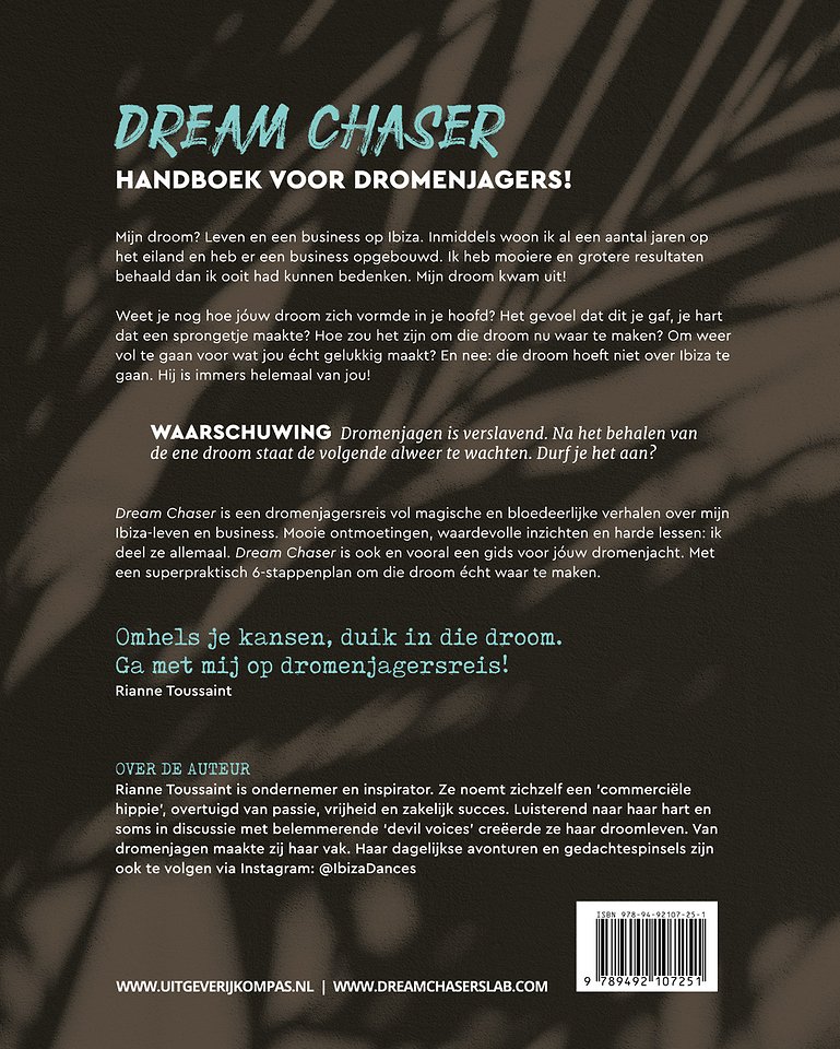 In 'Dream Chaser' vertelt Rianne Toussaint ('commerciële hippie') met schitterende beelden en eerlijke verhalen waarom en hoe ze haar droom van een leven en een business op Ibiza heeft verwezenlijkt. In zes stappen ontdek je hoe ook jij jouw dromen vorm kunt geven en werkelijkheid kan maken. Maar pas op: dromenjagen is verslavend. Na het behalen van de ene droom staat de volgende alweer te wachten!
