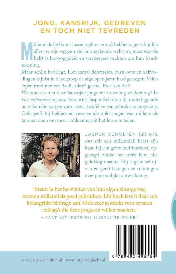 In Het millennial mysterie beschrijft Jasper Scholten de onderliggende oorzaken die zorgen voor stress, twijfel en een gebrek aan zingeving. Ook geeft hij heldere en verrassende oplossingen wat millennials kunnen doen om meer voldoening uit het leven te halen.