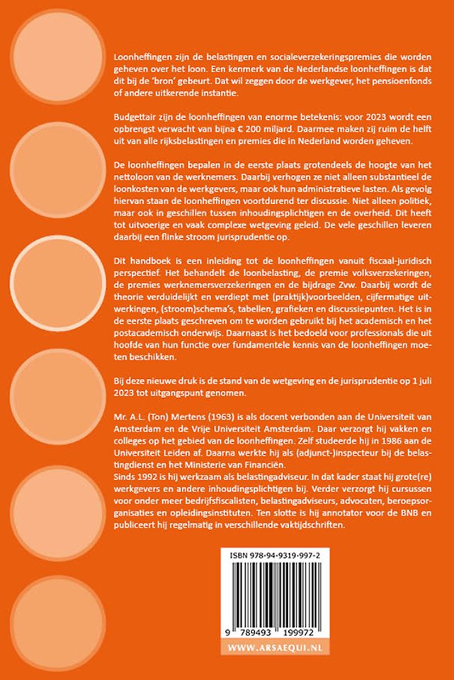Dit handboek is een inleiding tot de loonheffingen vanuit fiscaal-juridisch perspectief. Het behandelt de loonbelasting, de premie volksverzekeringen, de premies werknemersverzekeringen en de bijdrage Zvw. Daarbij wordt de theorie verduidelijkt en verdiept met (praktijk)voorbeelden, cijfermatige uitwerkingen, (stroom)schema’s, tabellen, grafieken en discussiepunten. Het is in de eerste plaats geschreven om te worden gebruikt bij het academisch en het postacademisch onderwijs. Daarnaast is het bedoeld voor professionals die uit hoofde van hun functie over fundamentele kennis van de loonheffingen moeten beschikken.