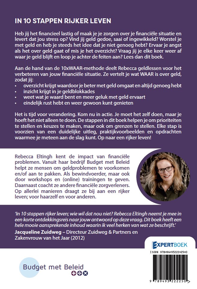 ‘In 10 stappen rijker leven; wie wil dat nou niet? Rebecca Eltingh neemt je mee in een korte ontdekkingsreis naar jouw antwoord op deze vraag. Dit boek heeft een hele mooie aansprekende inhoud waarin ik veel herken van wat ze beschrijft.’ - Jacqueline Zuidweg – Directeur Zuidweg & Partners en Zakenvrouw van het Jaar (2012)
