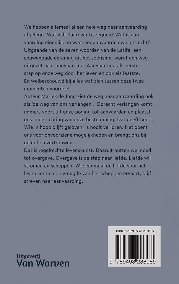 Uitgaande van de zeven woorden van de Latifa, een eeuwenoude oefening uit het soefisme, wordt een weg uitgezet naar aanvaarding. Aanvaarding als eerste stap op onze weg door het leven en ook als laatste. En welbeschouwd bij alles wat zich tussen deze twee momenten voortdoet.