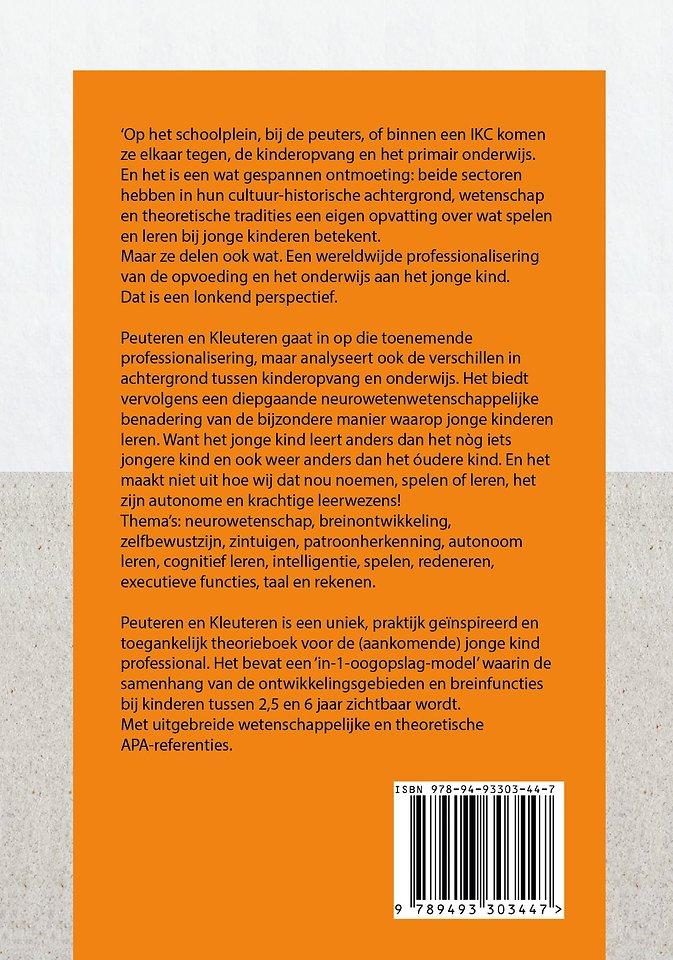 Thema’s: neurowetenschap, breinontwikkeling, zelfbewustzijn, zintuigen, patroonherkenning, autonoom leren, cognitief leren, intelligentie, spelen, redeneren, executieve functies, taal en rekenen. Peuteren en Kleuteren is een uniek, praktijk geïnspireerd en toegankelijk theorieboek voor de (aankomende) jonge kind professional. Het bevat een ‘in-1-oogopslag-model’ waarin de samenhang van de ontwikkelingsgebieden en breinfuncties bij kinderen tussen 2,5 en 6 jaar nzichtbaar wordt. Met uitgebreide wetenschappelijke en theoretische APA-referenties.